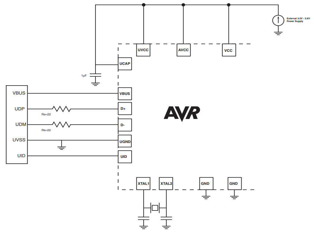 ² The ATmegaXXu2 datasheet shows an UID pin on the AVR part, but this pin does not exist and can be ignored.