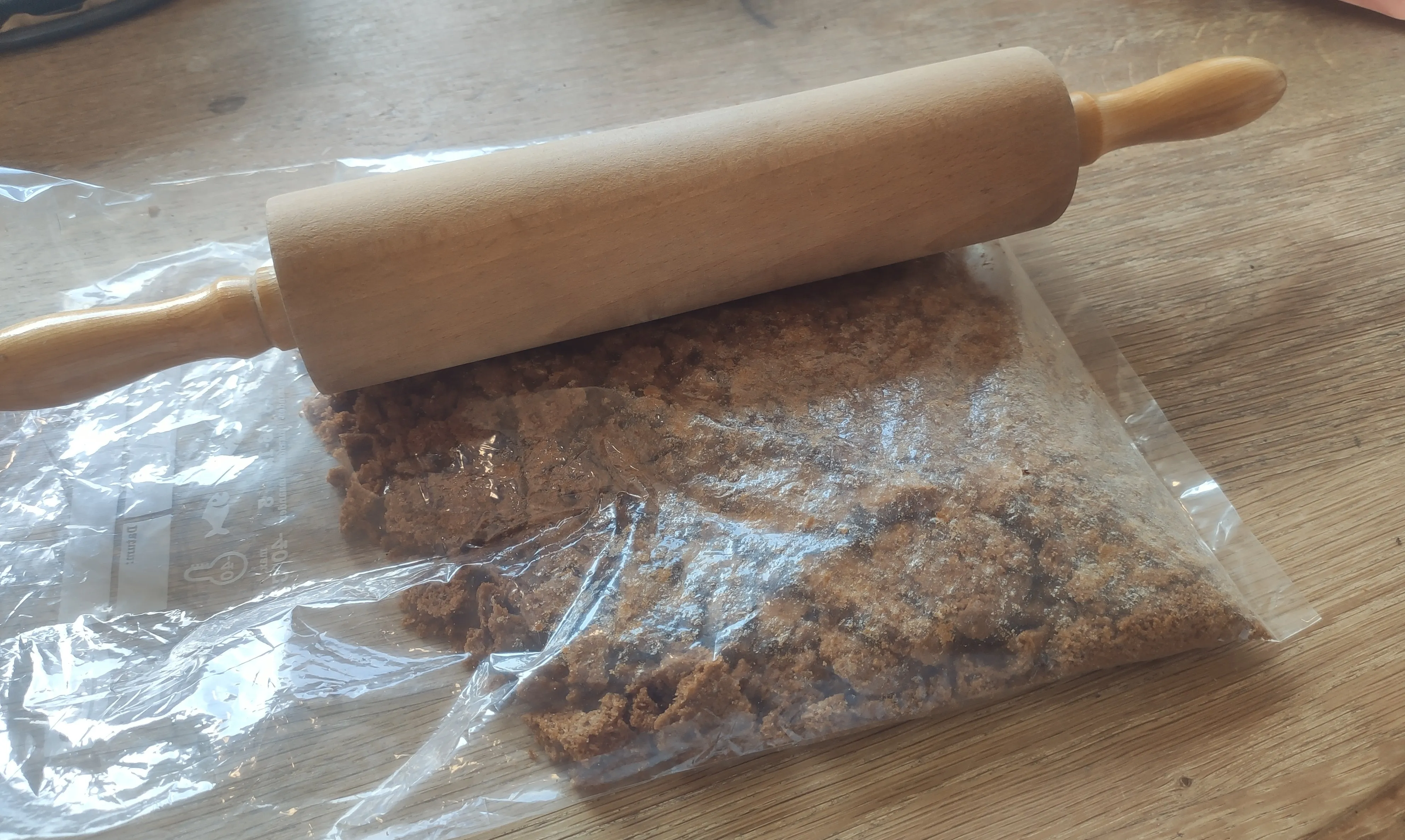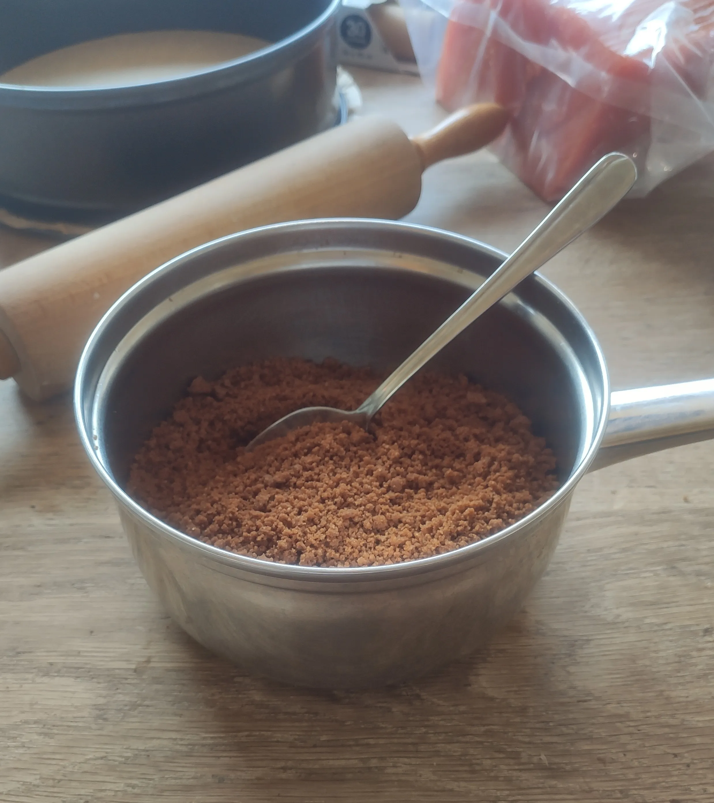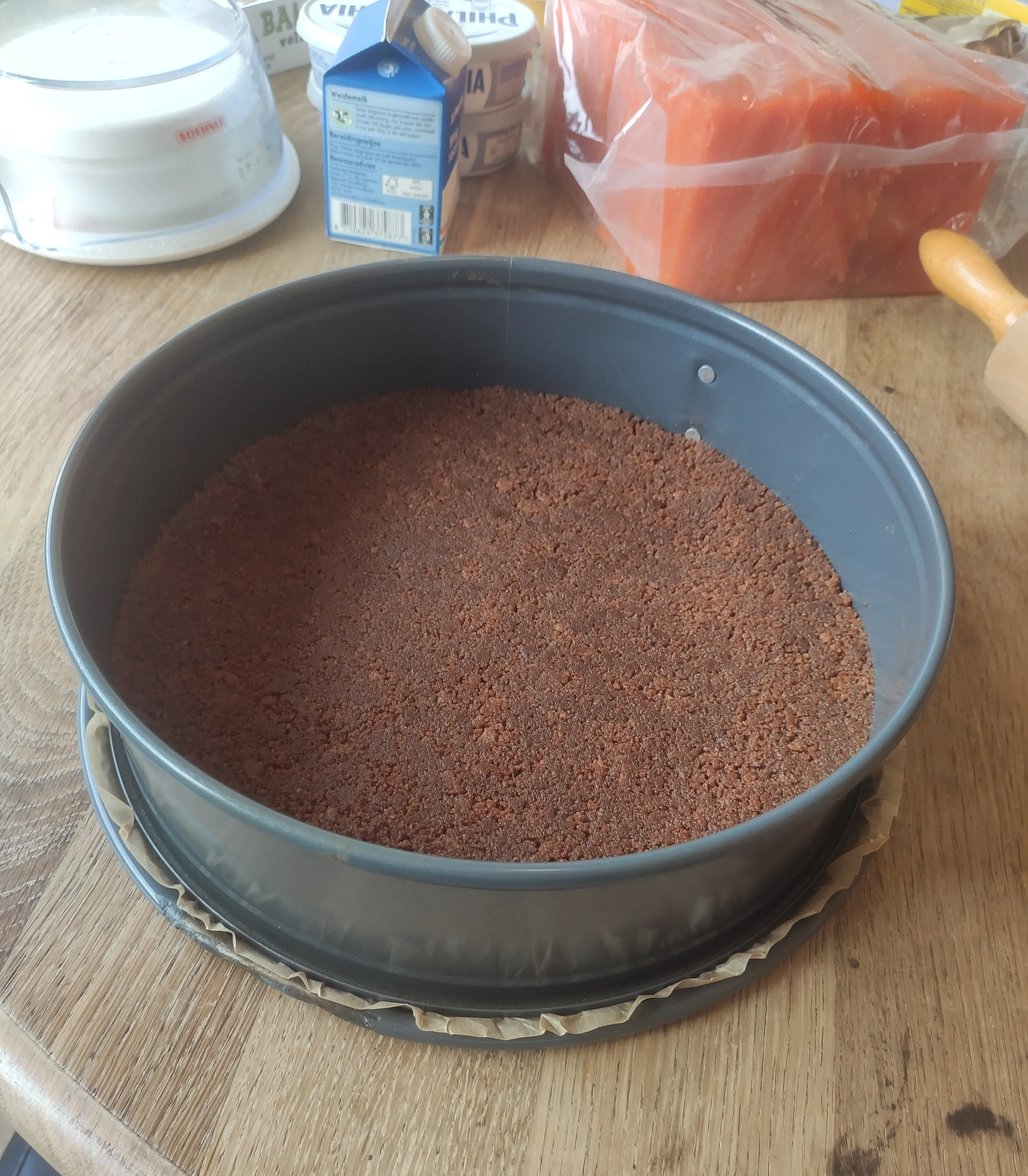 Making the crumbled cookie bottom is very simple, simply crush the cookies and mix it with molten butter:
