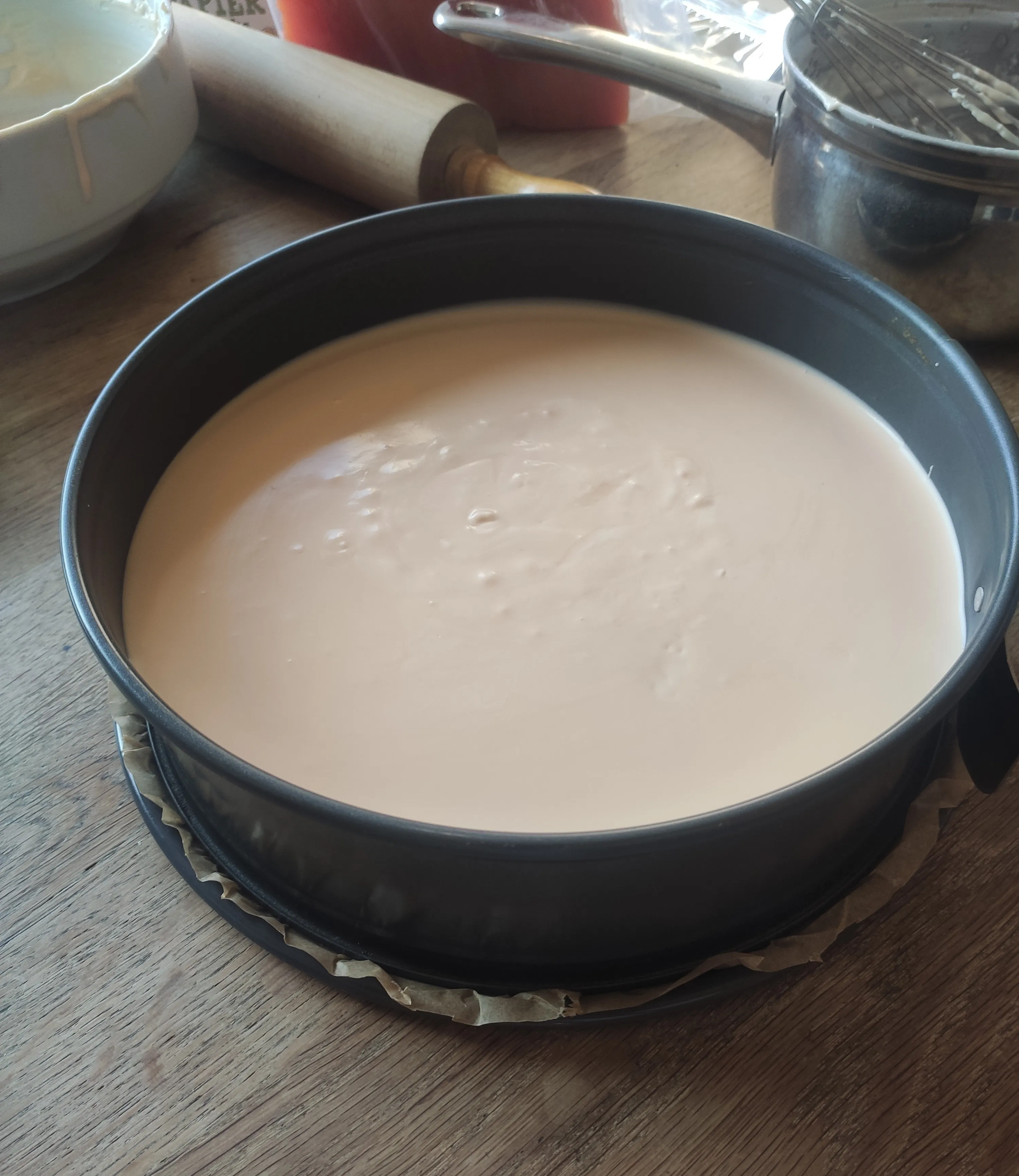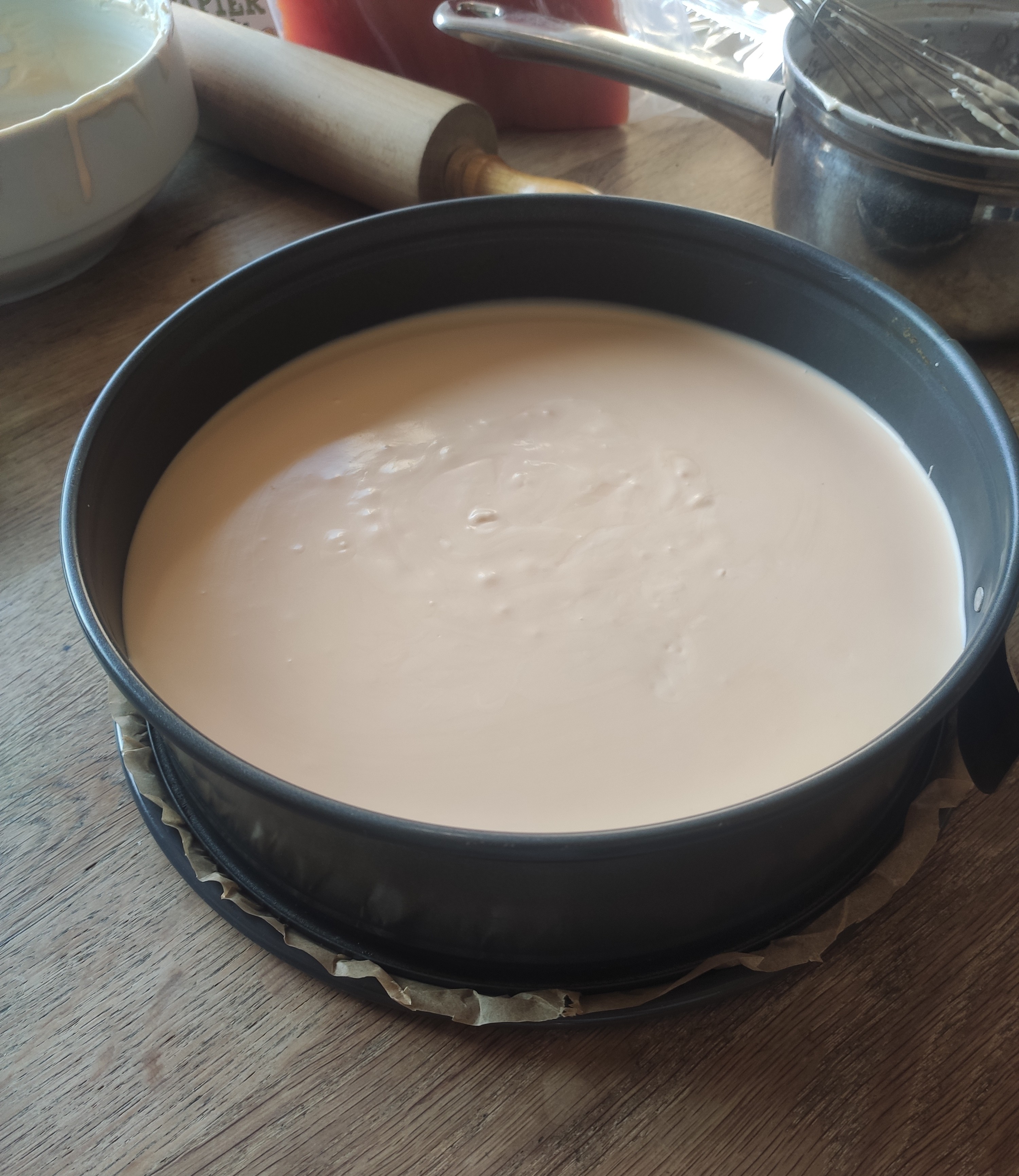 It is VERY important to let the cheese layer cool for a while before adding the jelly layer. I was not careful enough so they mixed. I recommend leaving it in the fridge for atleast an hour before adding the jelly layer. If all went according to plan, all you need to do is leave it in the fridge for a good while until the entire cake is stiff.