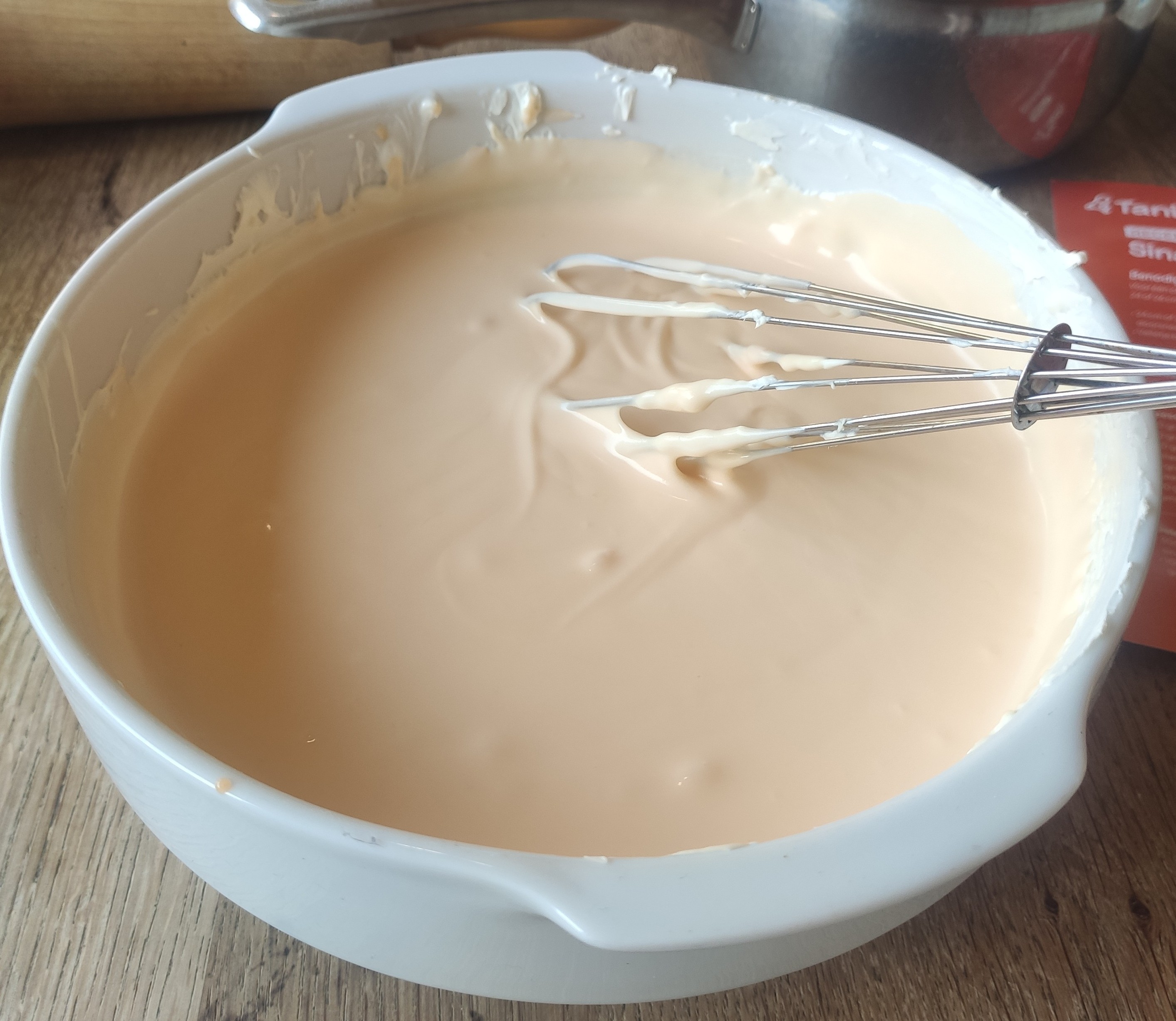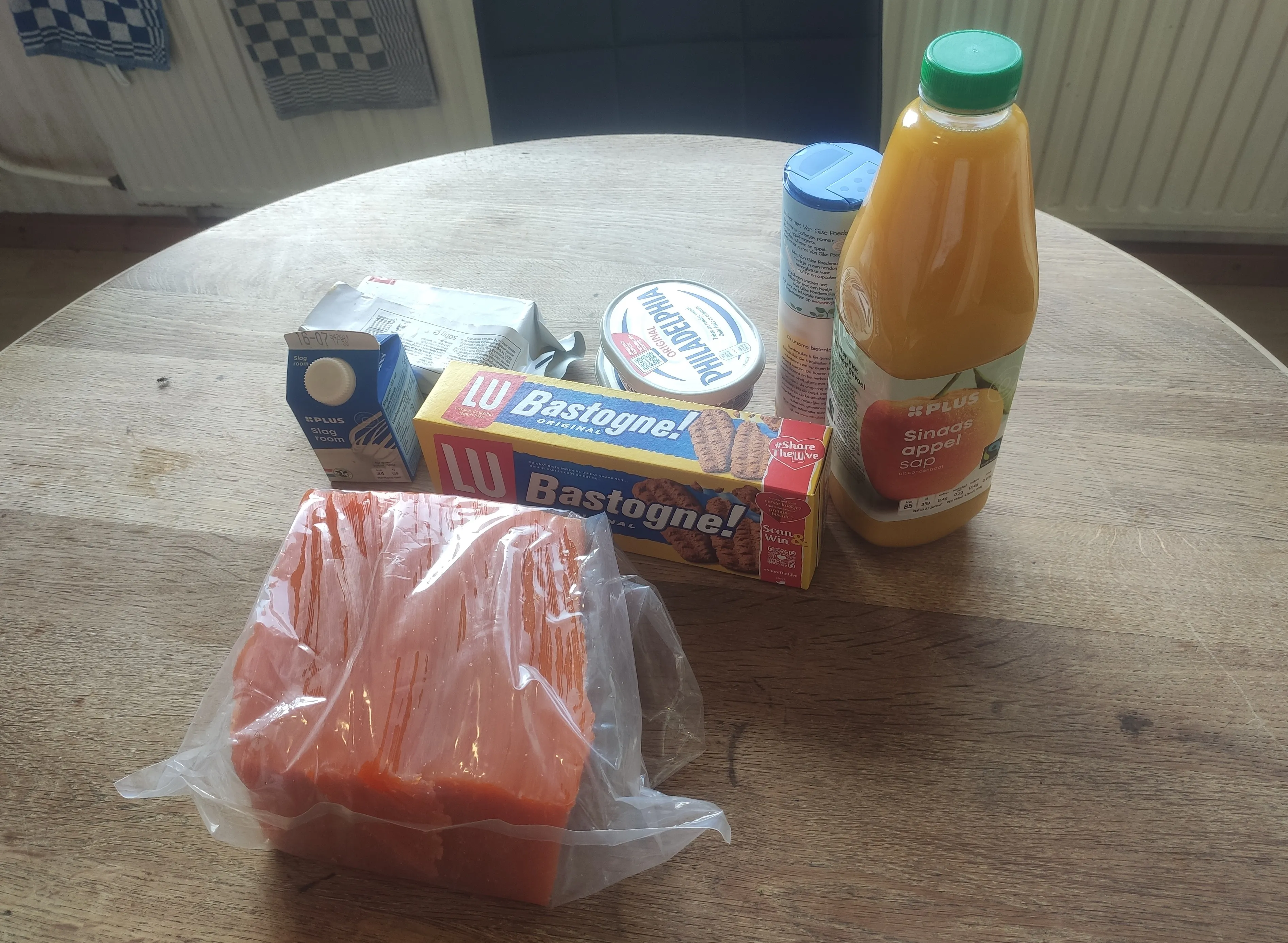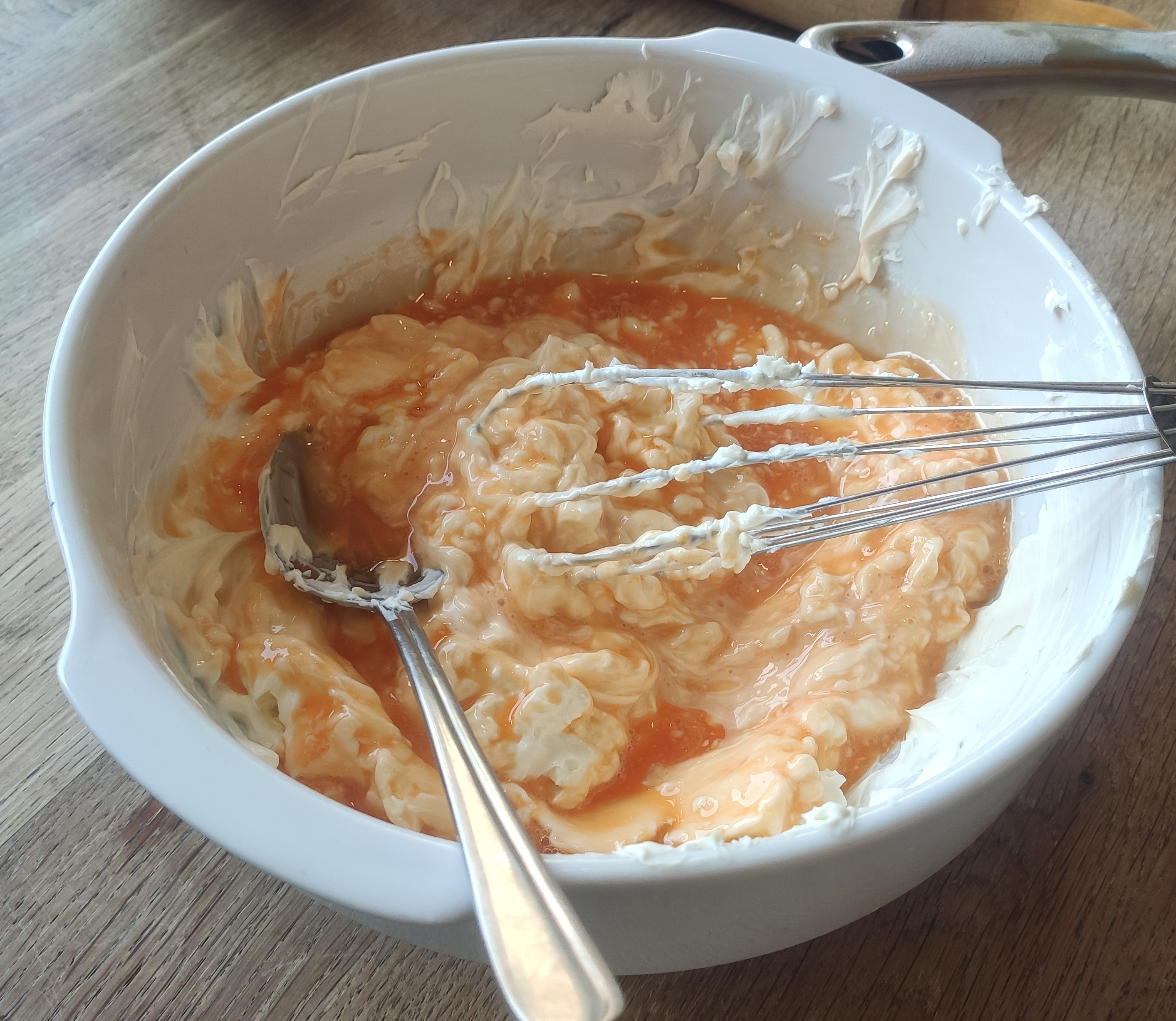 And push it into the shape of a cake bottom using a large spoon, as can be seen above. Place the cake in the fridge while you prepare the creamcheese layer. The cream layer just consists of mixing the powdered sugar, cream, cream cheese and a molten teddy-orange juice mix.