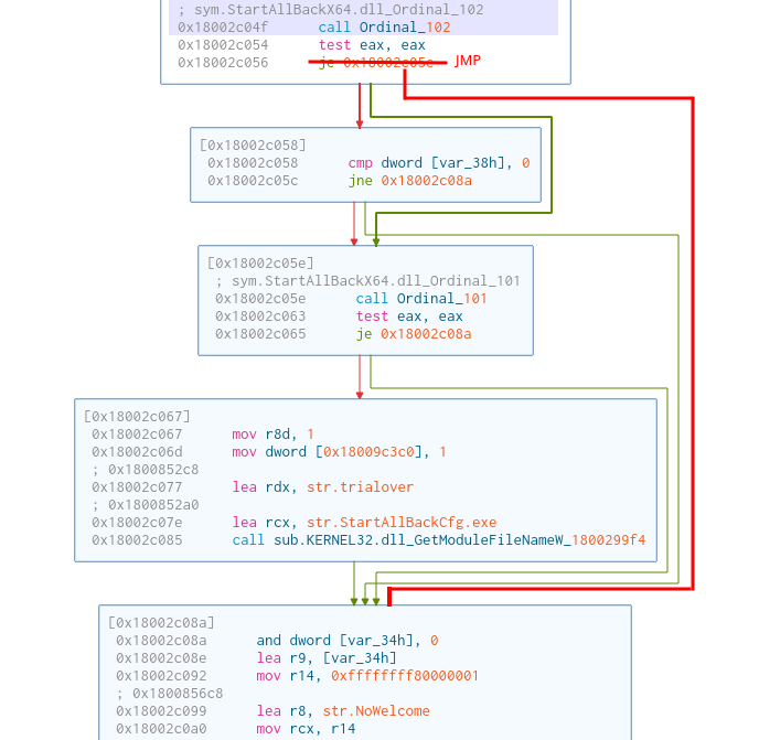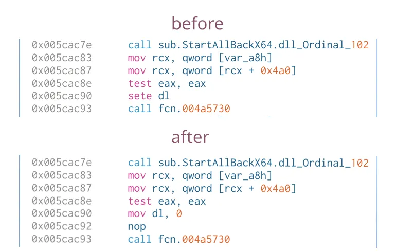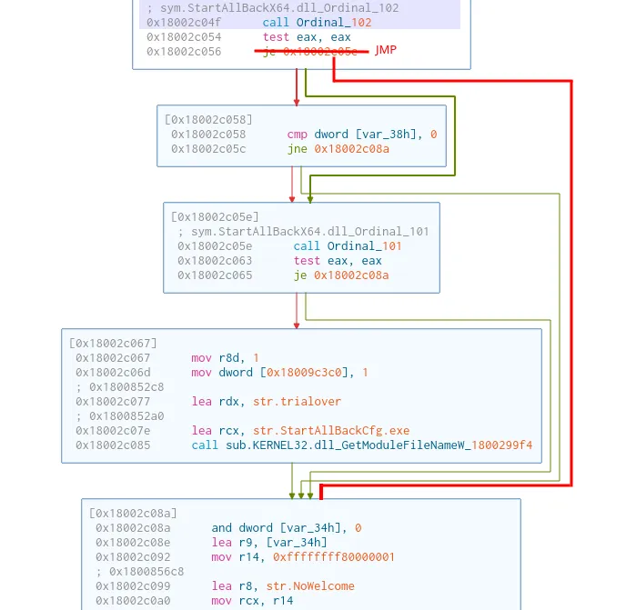 But lets say that we don’t want to extend the trial, but that we want to fully bypass the license verification. A simple string search leads us to the string called str.trialover. We can see that the code calls the Ordinal_101 (trial duration check) function after the Ordinal_102 (License check) function. If we simply change the jump after the license verification function, we can fully bypass the start menu’s license verification. An example of this can be seen in the image below.