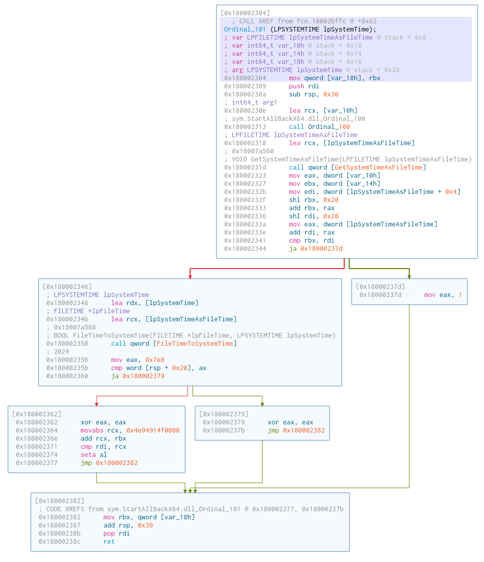 Curiously enough, this function seems to call the previous function Ordinal_100. It then compares that with the system time, and if it determines that the system time is smaller (this is normally an earlier timepoint), it returns true. Otherwise the function return false. (Both the system time as file time, and the file time as system time are checked for some reason).