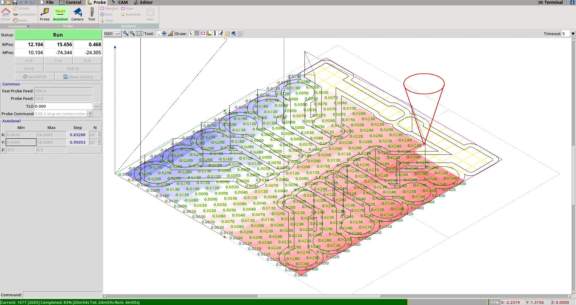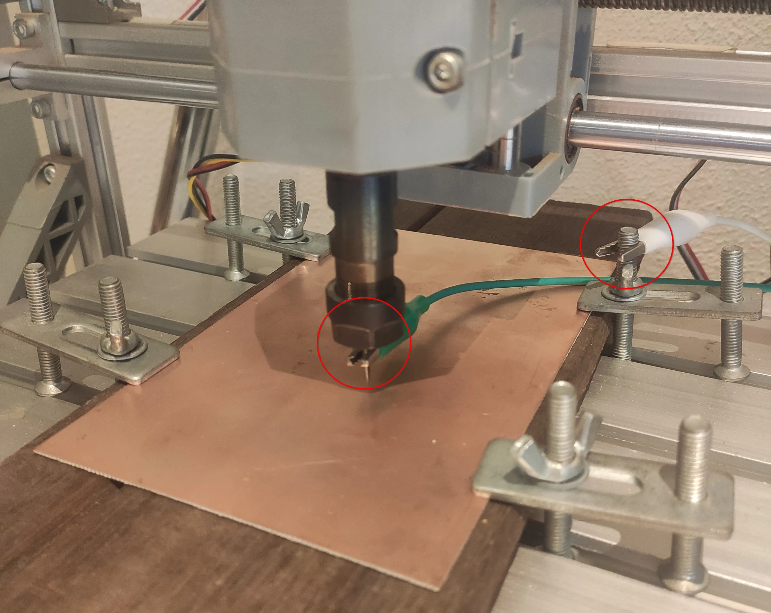 There is however a solution to the uneven copper surface. Copper is conductive (duh!), and we can use this property to create a heightmap. Simply connect two probes to the mill and surface, and tell bCNC to scan the surface.
