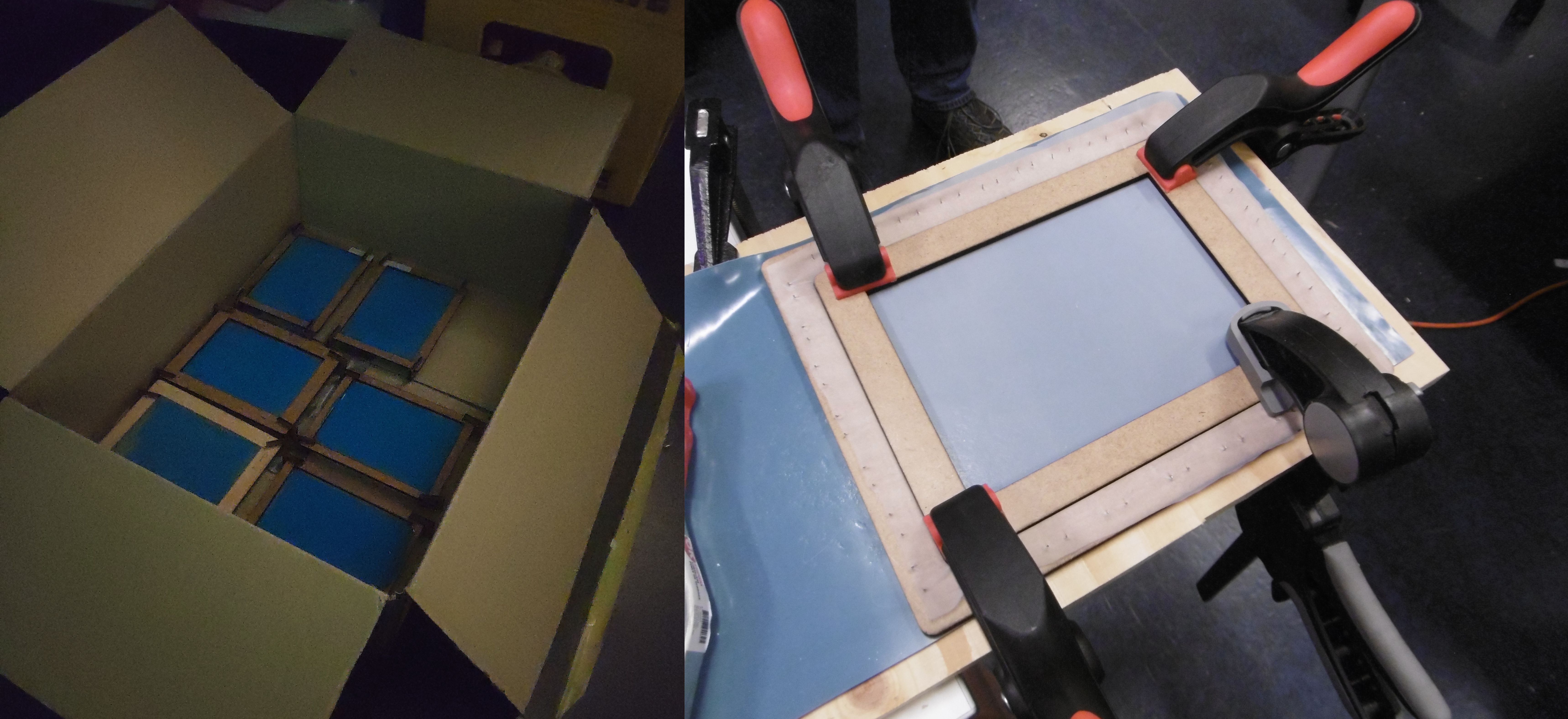 The kit only shipped with a single, large A3 frame. This allows you to print large designs, but it also requires a lot of photoresist to fully cover. It also makes it a lot harder to create a workshop because that would require each participant to progress at the same pace. But most of all, a large frame is simply a lot less cute. That is why we decided to create several small frames, A6 size. The frames are made using lasercut wood. We had a few issues while trying attach the screen (while being under tension), we tried several different methods, using all kinds of clamps and but in the end an embroidery frame worked the best.