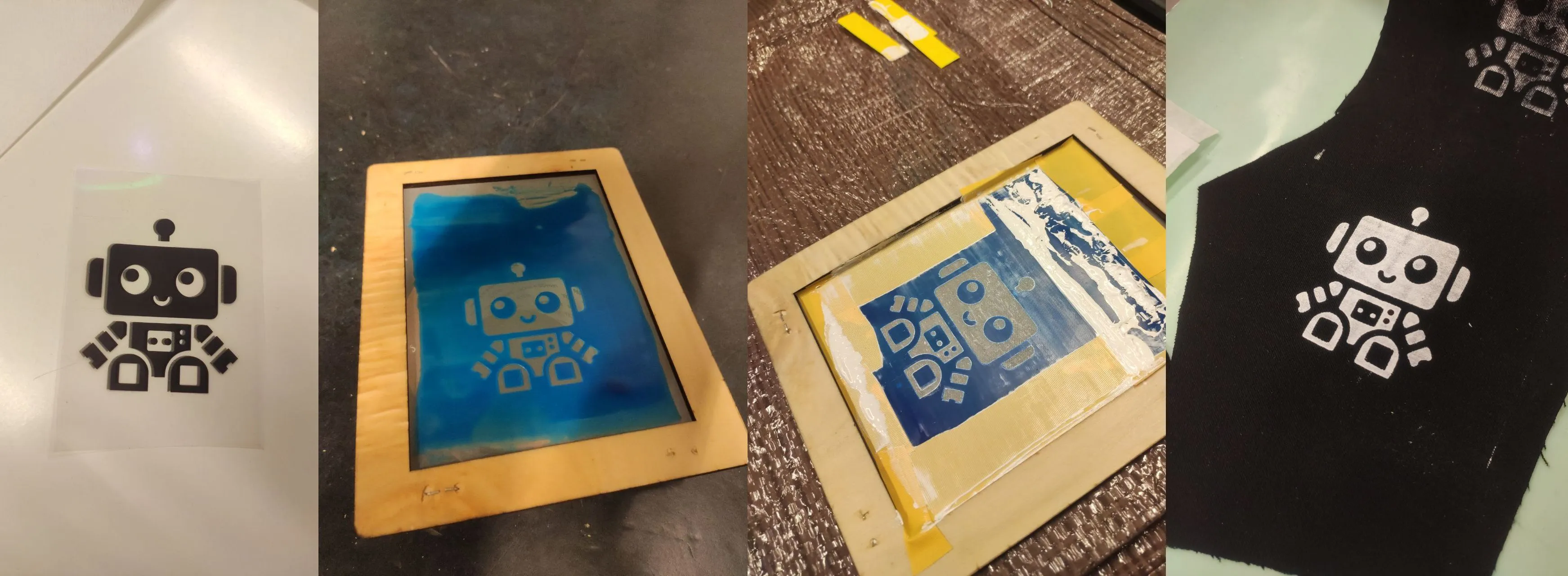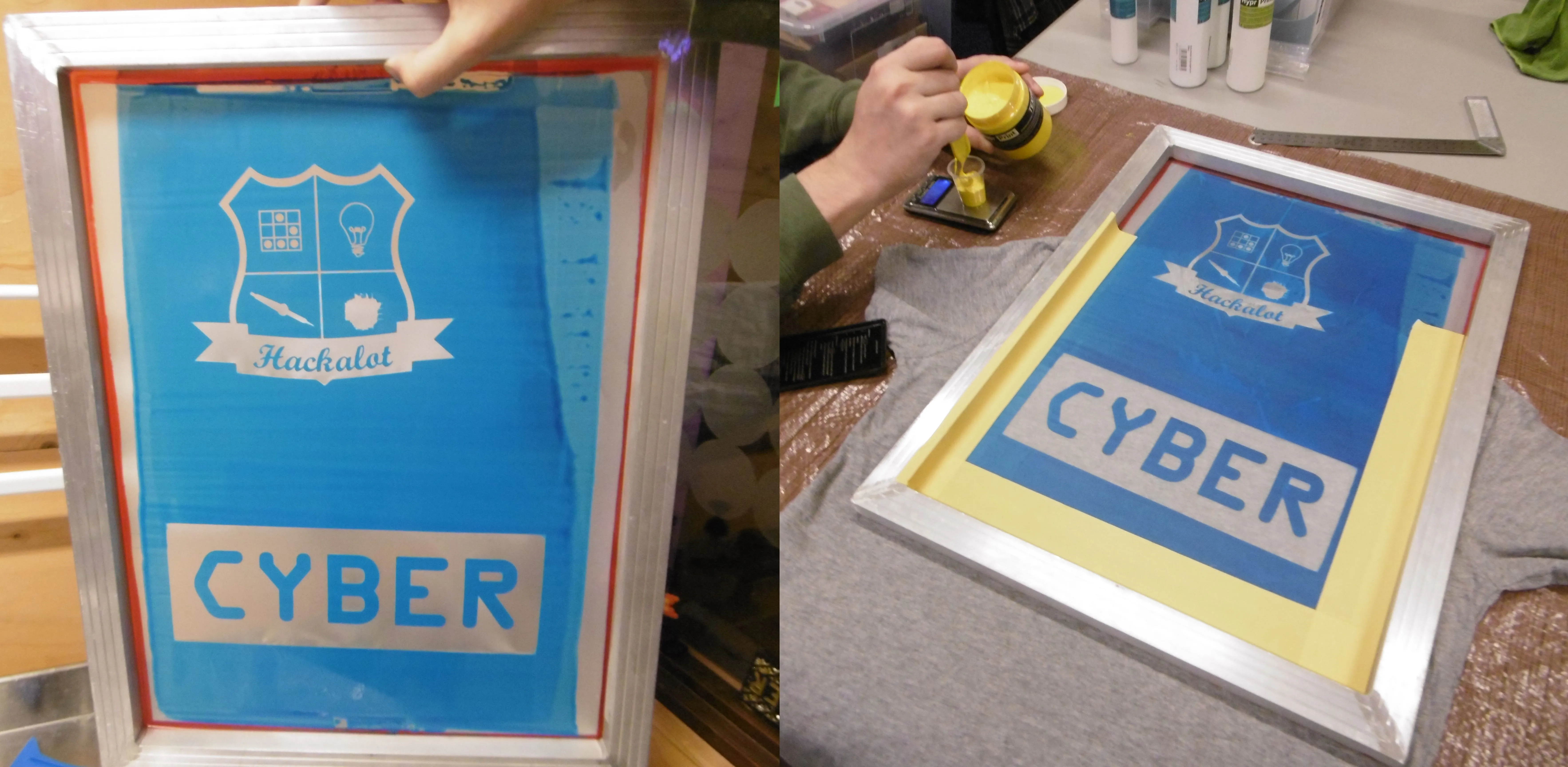 We recently bought a screenprinting kit at my local hackerspace. This kit consists of a mesh screen, clear printable films, screenprinting dye, screenprinting photoresist, a squeegee and a powerful light. This kit makes it possible to print custom designs on fabric, like shirts. The process is very similar to making circuit boards. Because the kit was bought by a group of people, we decided that it would be a fun opportunity for a screenprinting workshop.