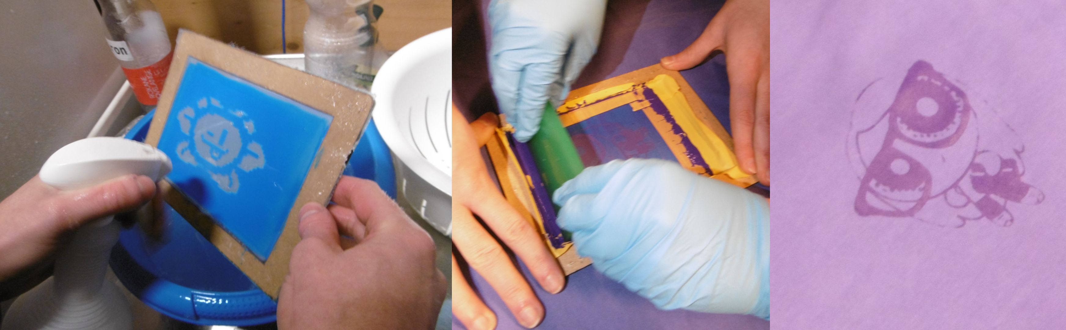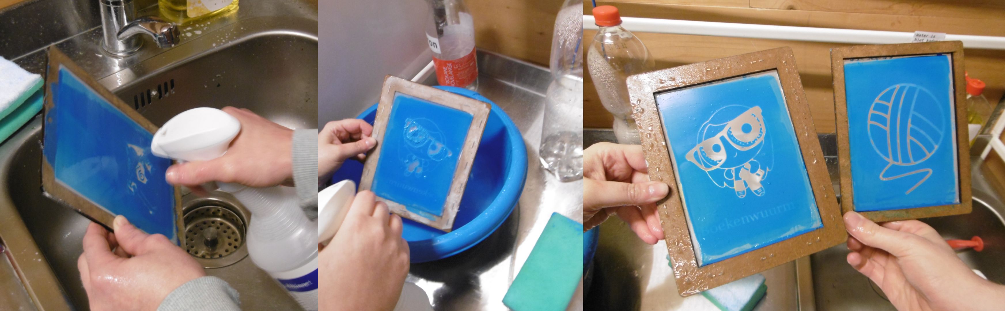 The images above show the coating process, followed by the washing of the frames until all unexposed photo resist is gone, and the finally printing the design. A few more results of the workshop can be seen below: