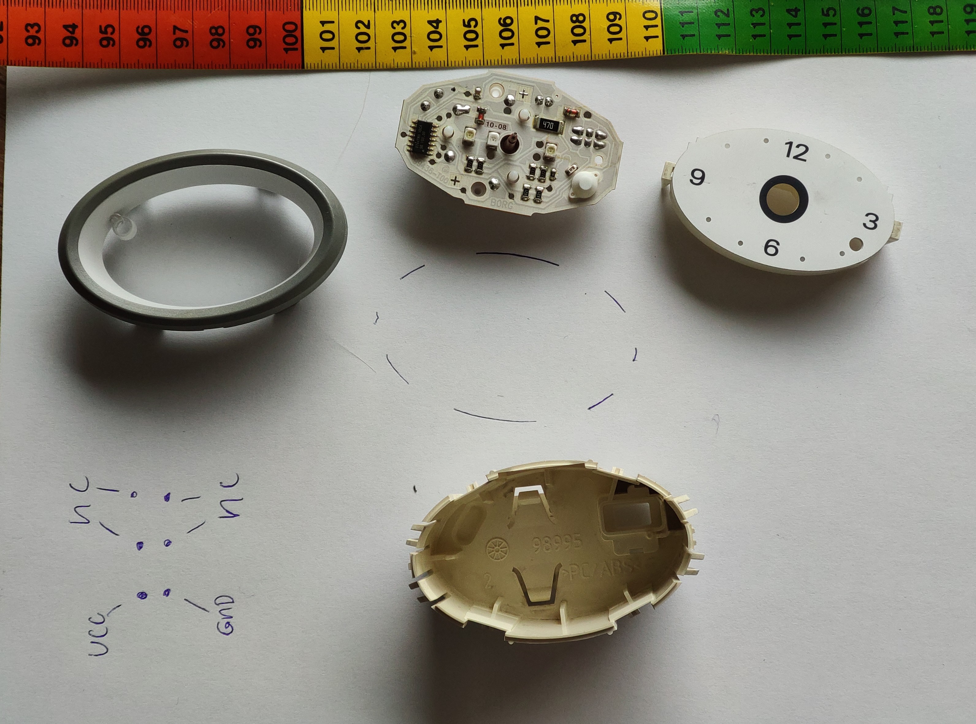 The new scope of the project was to simple replace the clock in my car’s dashboard. Simply disassemble the original clock, take a photo that includes an item with a known size to determine the size (like a tape measure!) and then trace any shapes you need in Inkscape and continue from there.